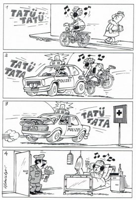 Ein Mann fährt auf der Straße mit dem Fahrrad und hat Kopfhörer auf, sodass die Musik das „Tatütata“ von der Polizei übertönt. Der Fahrradfahrer hört die Polizei nicht und fährt voll in das Auto der Polizei rein. Der Polizist bringt den Fahrradfahrer ins Krankenhaus. Am nächsten Tag bringt der Polizist ihm Blumen und der Fahrradfahrer hört immer noch Musik.